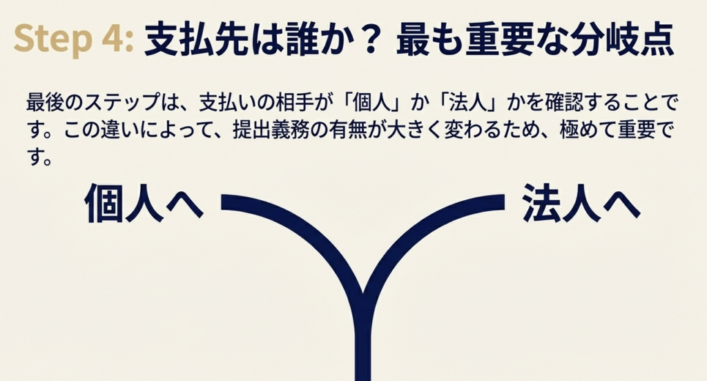 この支払先の区分は、実務上で最も誤りが生じやすい最重要ポイントです。 相手が個人か法人かによって、取り扱いが大きく異なります。