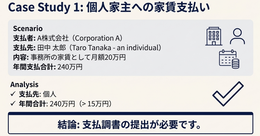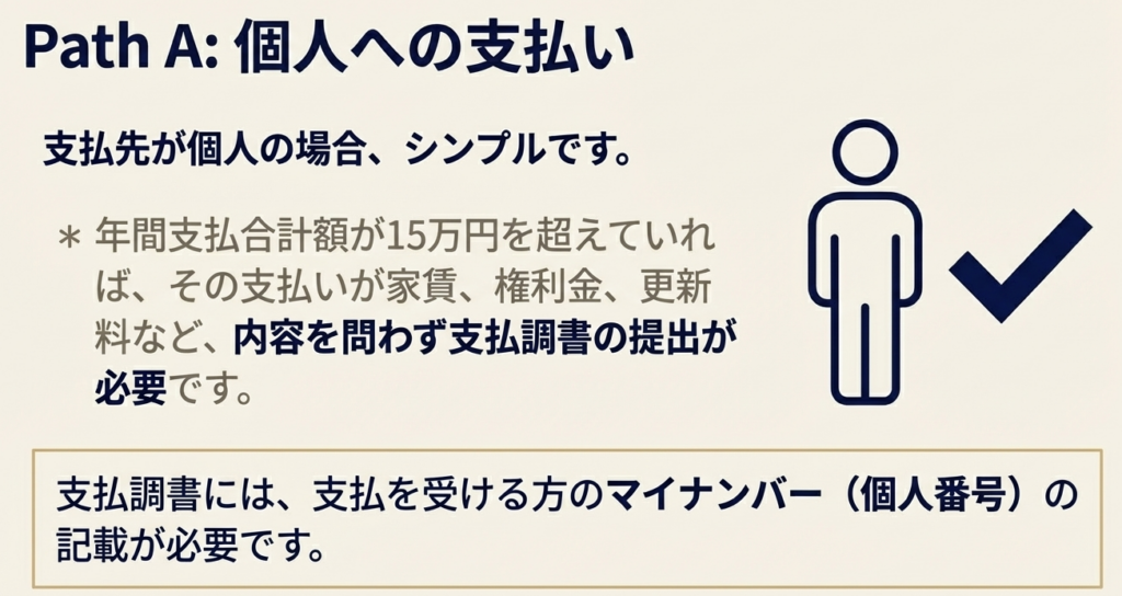 支払先が個人の場合はシンプルです。同一の個人に対して支払ったその年中の不動産使用料等の合計額が15万円を超える場合、支払調書を提出する必要があります。