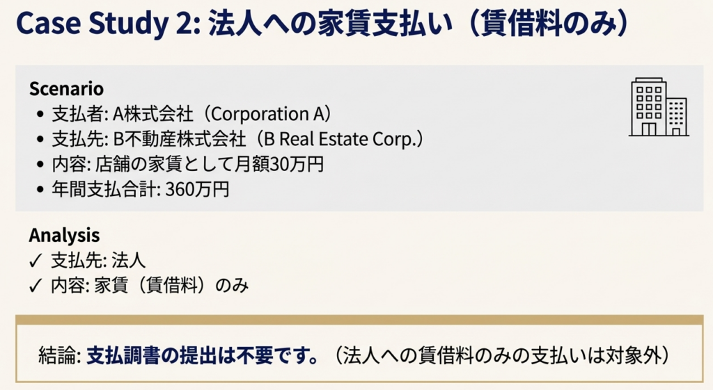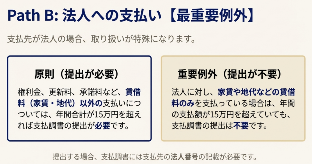 ・これが最も重要なルールです。支払先が法人の場合、支払内容が家賃や賃借料のみであれば、支払調書の提出は不要です。