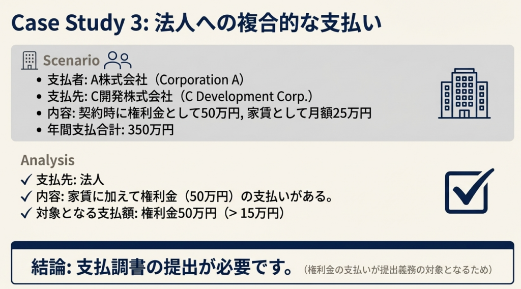 実務上、最も多い誤りが、法人に支払っている事務所家賃などについて支払調書を作成・提出してしまうケースです。これは不要な事務作業ですので、「支払先が法人で、内容は家賃のみ」であれば対象外であると明確に覚えておきましょう。