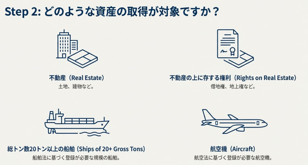 対象は不動産に限りません。20トン以上の船舶や航空機の取得も含まれます。これらの高額資産の取引は見落としが許されないため、契約内容を必ず確認してください。