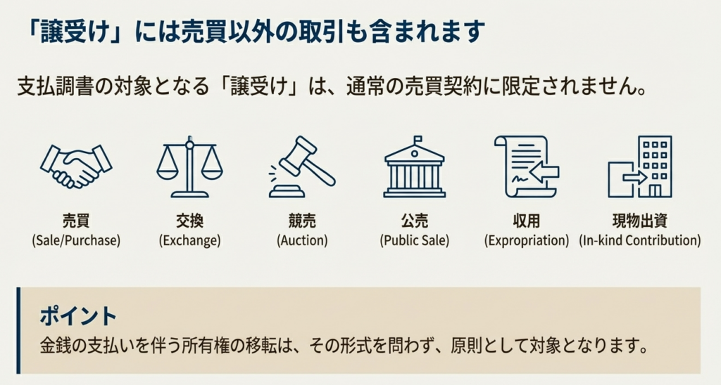 一般的な売買のほか、交換、競売、公売、収用、現物出資等による取得も含まれます。これにより、所有権が移転する幅広い形態の取引が支払調書の対象となります。
