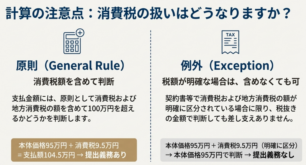• 原則: 消費税および地方消費税の額を含めて100万円を超えるかどうかを判断します。