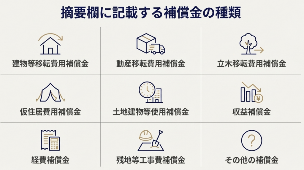 9. 摘要欄に記載すべき補償金の種類を3つ挙げてください。