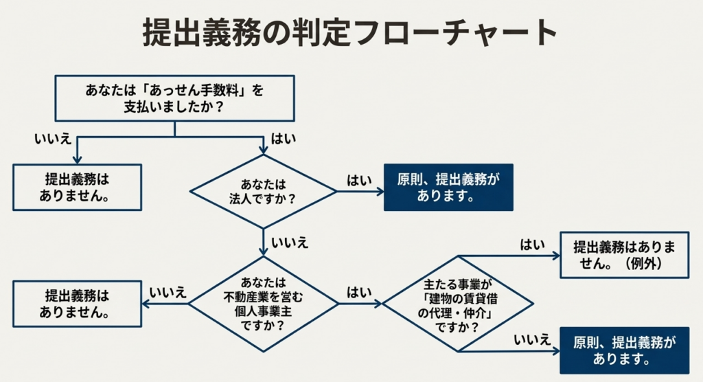 これは、売買仲介に比べて取引単価が低く、事業規模も多岐にわたる賃貸仲介業者にまで広範な事務負担を課すことを避けるための措置と考えられます。したがって、同じ不動産業を営む個人であっても、事業の主目的が土地建物の「売買」の仲介なのか、建物の「賃貸借」の仲介なのかによって、提出義務の有無が分かれることになります。