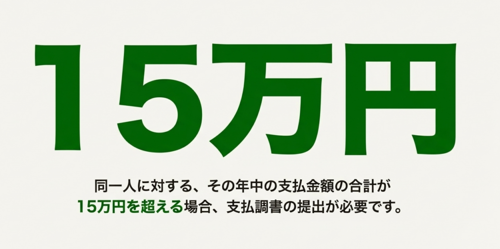 提出が必要となる金額基準は、「同一人に対するその年中の支払金額の合計が15万円を超えるもの」です。