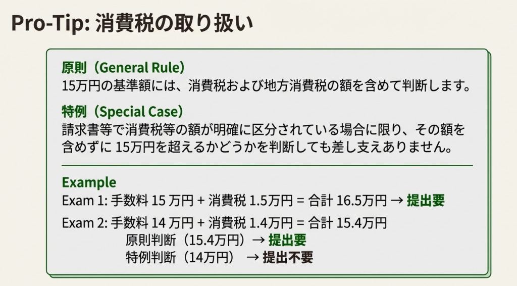 15万円の基準額には、原則として消費税および地方消費税の額を含めて判断します。ただし、請求書等で消費税額が明確に区分されている場合に限り、税額を含めないで判断することも認められています。