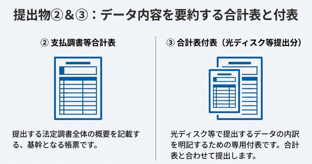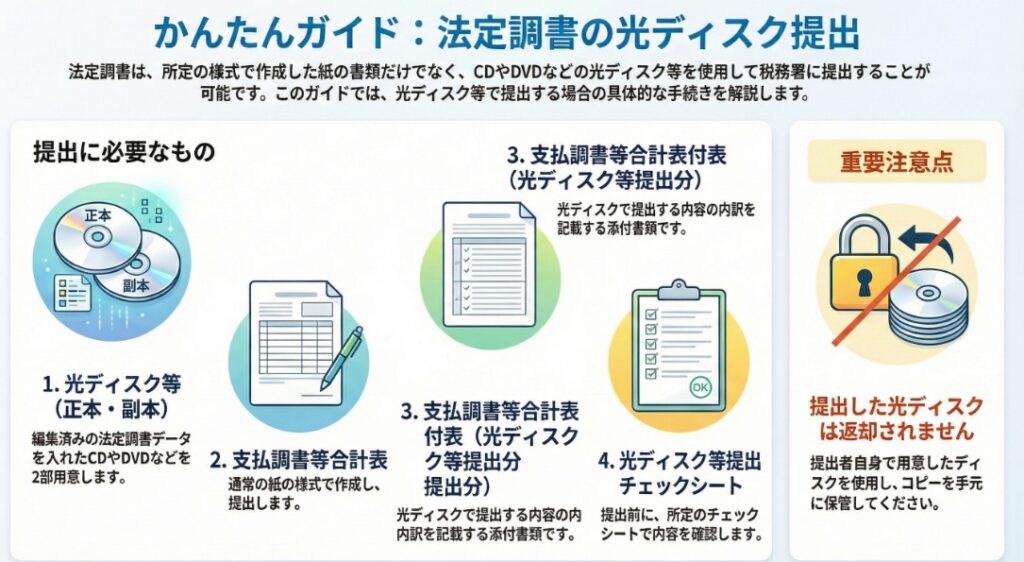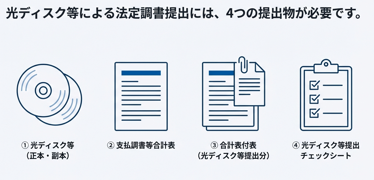 光ディスク本体以外に、「支払調書等合計表」、「支払調書等合計表付表(光ディスク等提出分)」、そして「光ディスク等提出チェックシート(法定)」の3つを提出する必要があります。