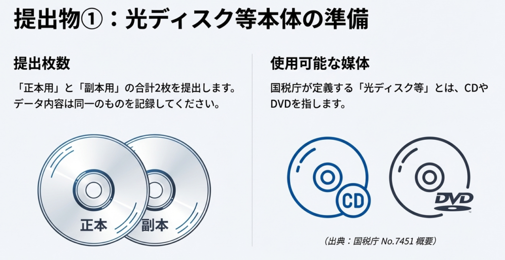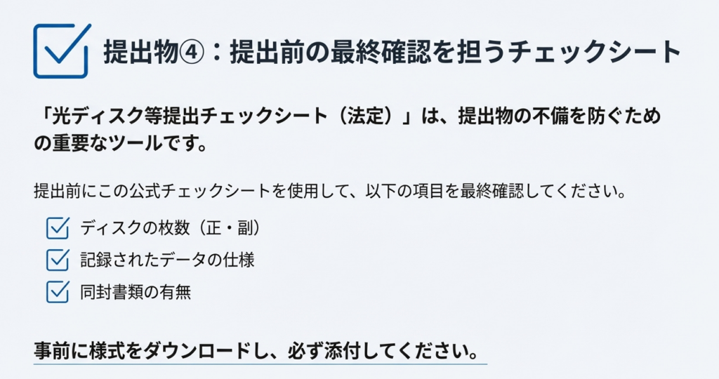 多忙な実務担当者の皆様が、迅速に要点を把握できるよう、まずは光ディスク等による提出プロセスで最終的に行うべき核心的な作業を先に提示します。複雑に見える手続きも、ゴールから逆算することで理解が容易になります。