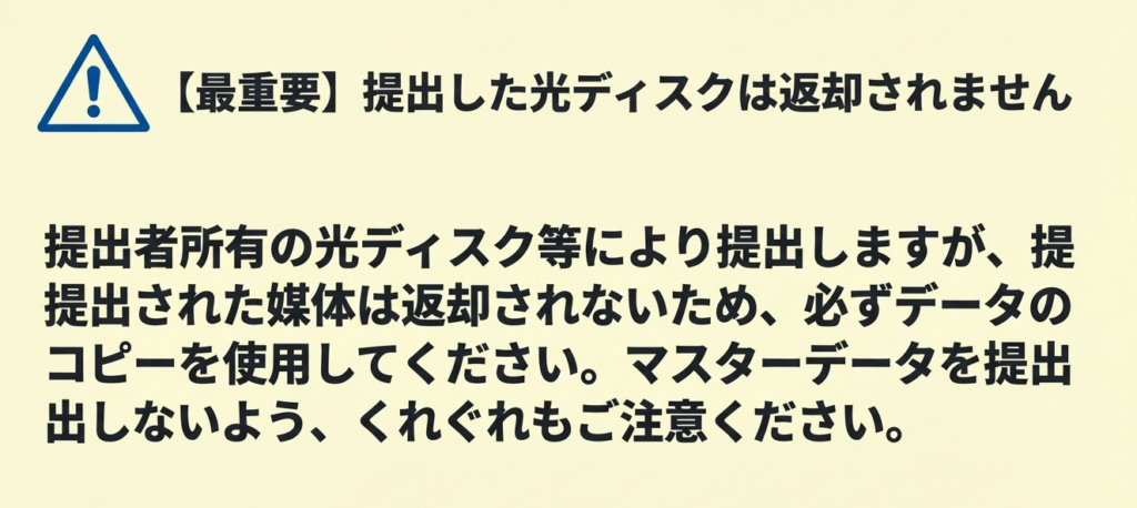 いいえ、提出された光ディスク等は返却されません。そのため、提出者はその点に注意する必要があります。