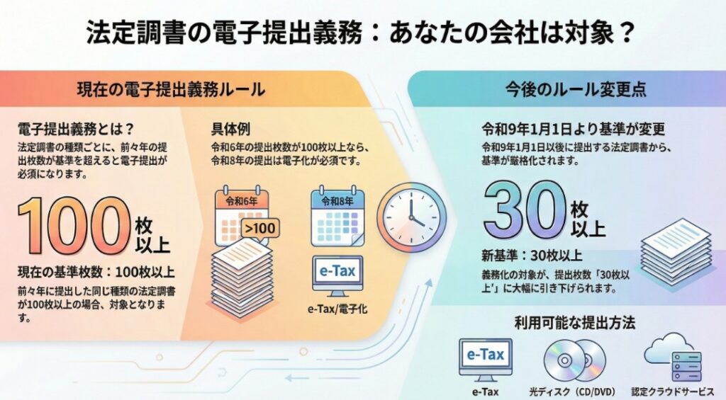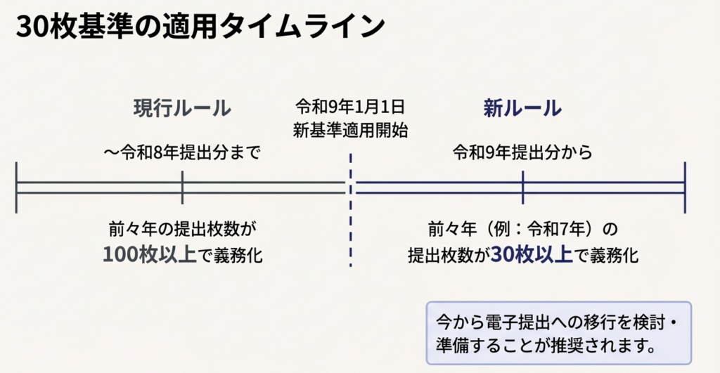 現在の基準である「100枚以上」は、令和9年1月1日以後には「30枚以上」に引き下げられる予定です。これにより、より小規模な事業者も電子提出義務の対象となります。
