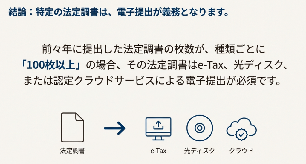 法定調書の種類ごとに、前々年に提出すべきであった当該法定調書の提出枚数が100枚以上である場合に、電子的な提出が義務付けられます。この義務は、e-Tax、光ディスク等、または認定されたクラウドサービス等のいずれかの方法で果たす必要があります。