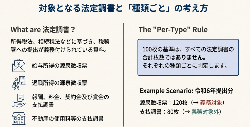 法定調書の種類ごとに、前々年に提出すべきであった枚数が100枚以上の事業者が対象となります。