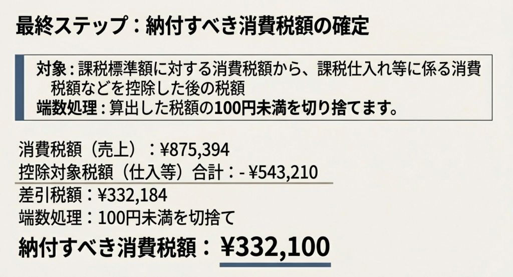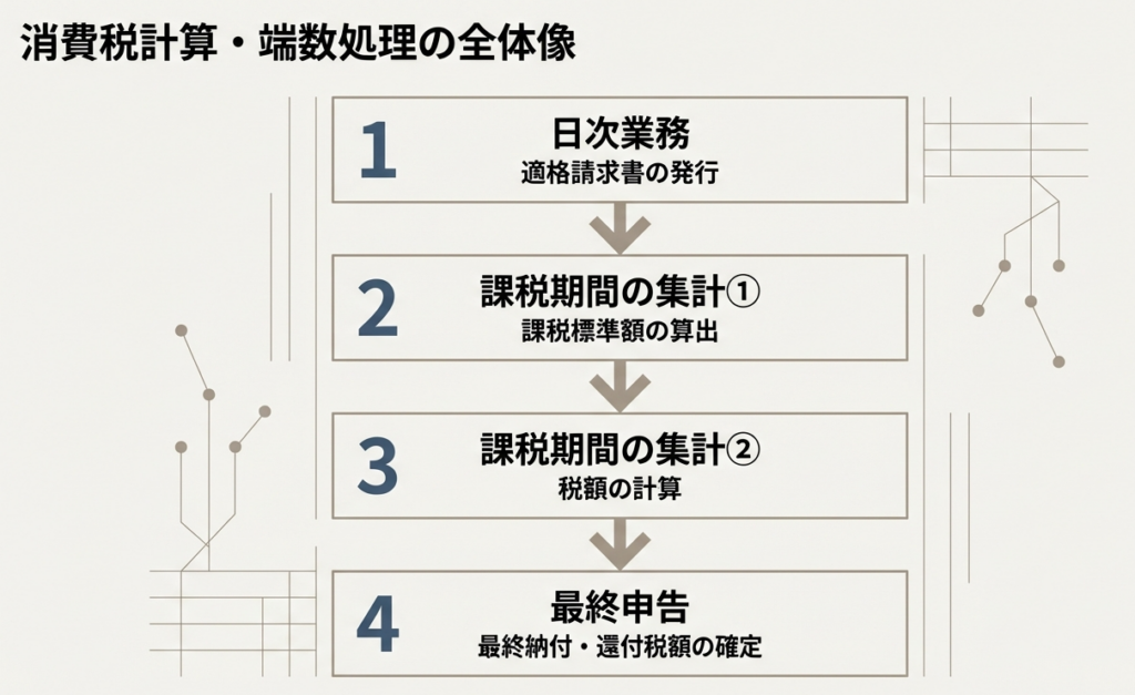 消費税の計算は、課税標準額の算出から最終的な納付税額の確定まで、複数のステップに分かれています。そして、それぞれの段階で異なる端数処理のルールが適用されるため、全体像を先に把握しておくことが実務上の混乱を避ける鍵となります。