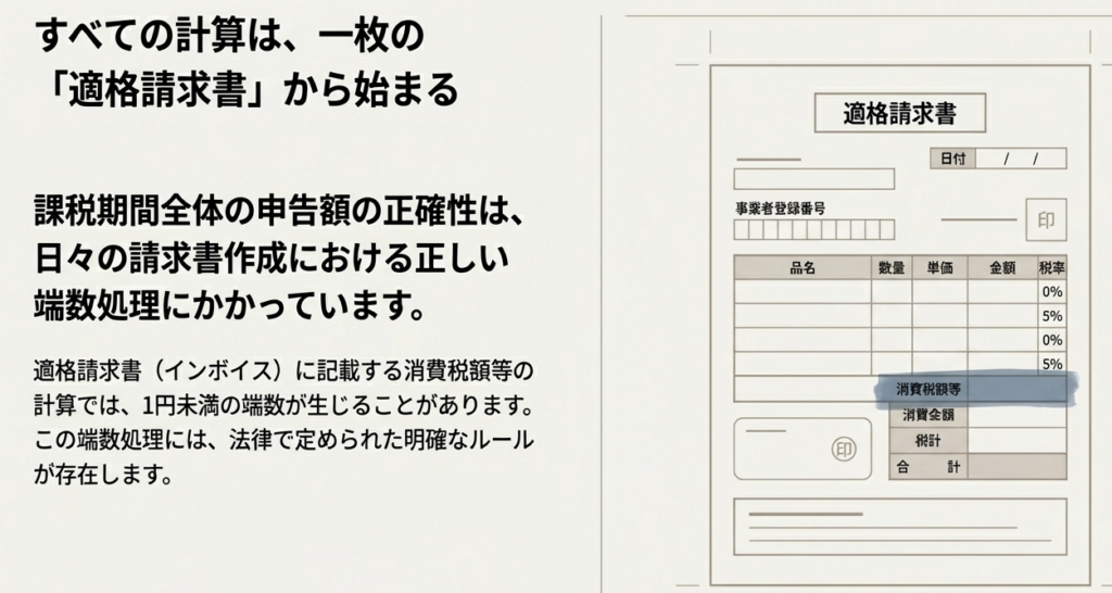 インボイス制度の導入に伴い、確定申告時だけでなく、日々の請求書発行業務においても端数処理のルールを意識する必要が生じました。適格請求書(インボイス)に記載する消費税額については、申告書作成時とは異なるルールが適用されるため、特に注意が必要です。