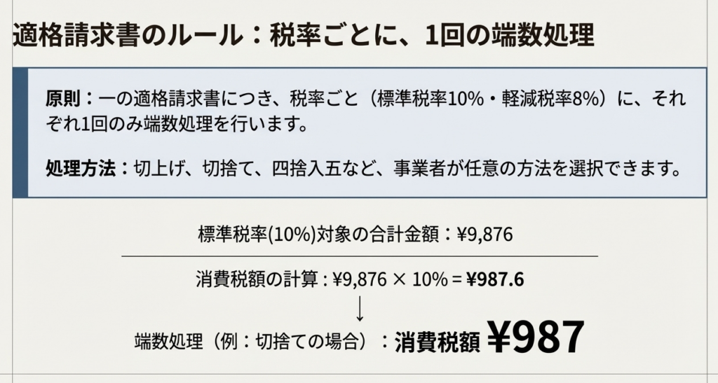 切り上げ、切り捨て、四捨五入など、端数処理の方法は発行事業者の任意とされています。