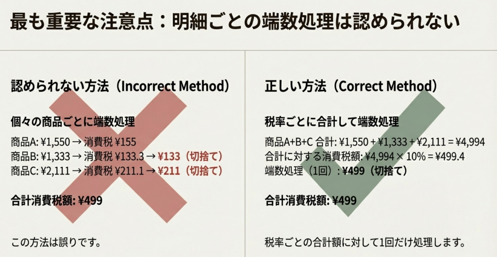 なお、ここで最も注意すべき点は、端数処理は必ず税率ごとの合計金額に対して一度だけ行うという点です。
