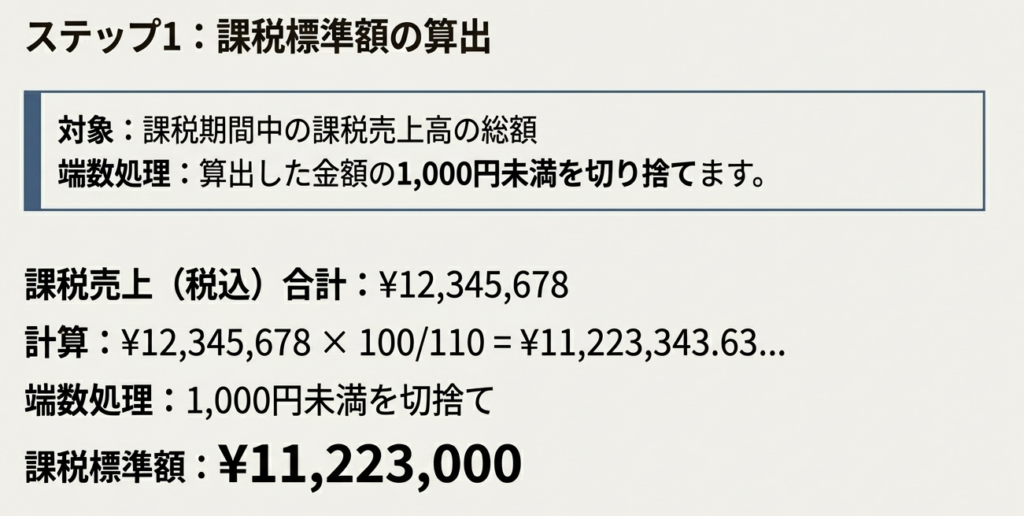 課税期間の課税標準額に1,000円未満の端数があるときは、その端数を切り捨てます。これは、課税資産の譲渡等の税込価額の合計額に所定の率を掛けて算出した後の金額に対して適用されます。