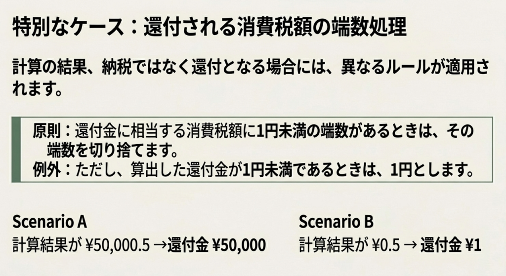 還付金に相当する消費税額に1円未満の端数がある場合は切り捨てられますが、計算後の還付金額そのものが1円未満であるときは、1円として扱われます。