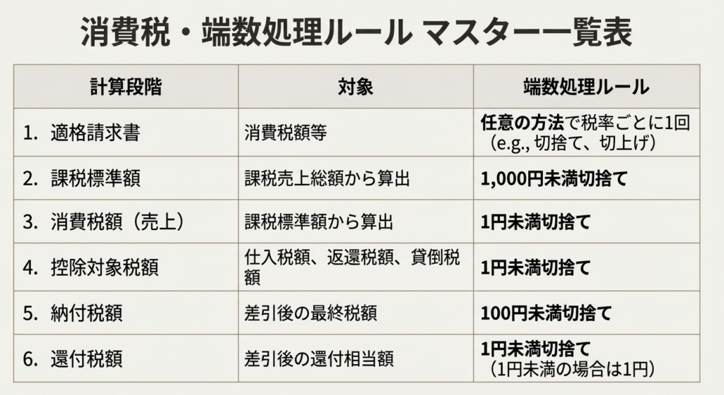 以下に、計算の各段階における端数処理ルールを一覧表にまとめました。まずはこの表で全体像をご確認ください。