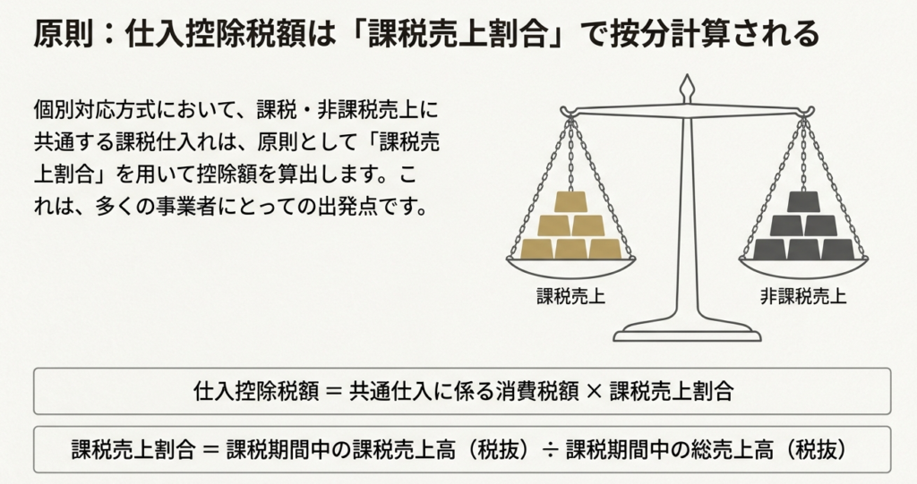 消費税の仕入税額控除を計算する際、多くの企業では「個別対応方式」を採用しています。この方式において、課税売上と非課税売上に共通して発生する経費(共通課税仕入れ)については、原則として「課税売上割合」を用いて按分計算することになります。しかし、この画一的な計算方法が、必ずしもすべての事業者の事業の実態を正確に反映しているとは限りません。