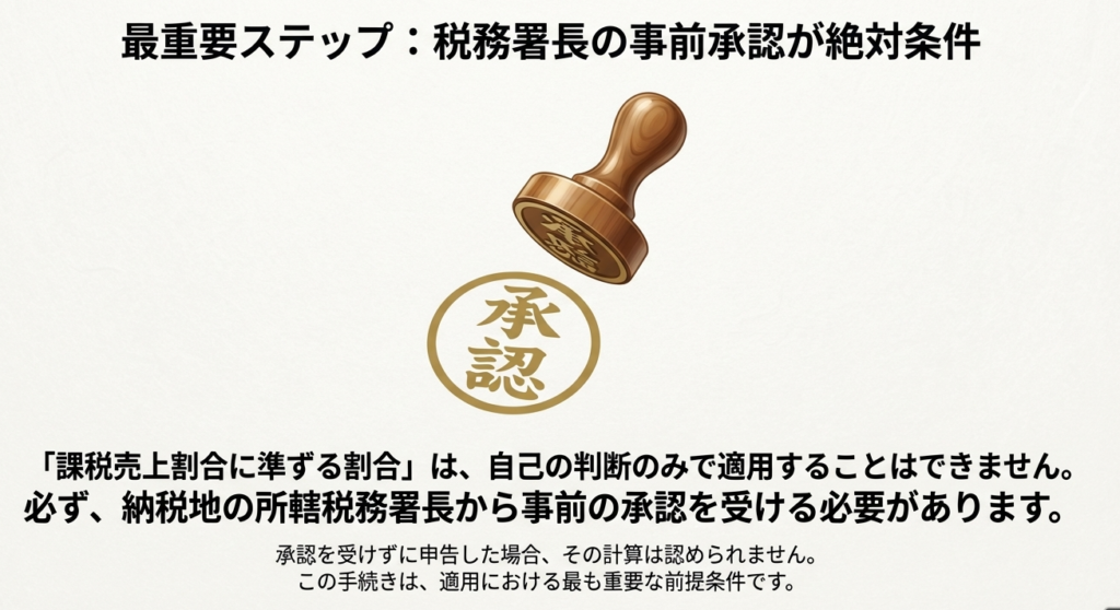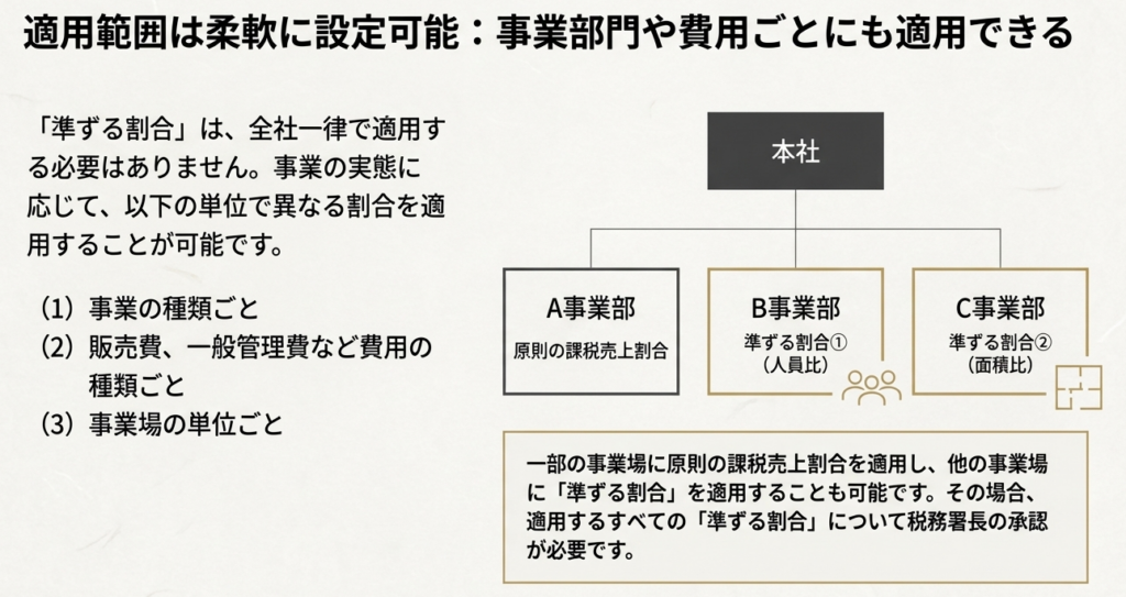 この適用範囲の柔軟性こそが、画一的な課税売上割合では捉えきれない事業の実態を正確に反映させ、「合理的」な計算方法を構築するための鍵となります。さらに、一部の事業場では原則的な課税売上割合を適用し、他の特定の事業場についてのみ、この準ずる割合を適用するといったハイブリッドな運用も可能です。ただし、その場合でも、適用するすべての準ずる割合について税務署長の承認が必要となります。