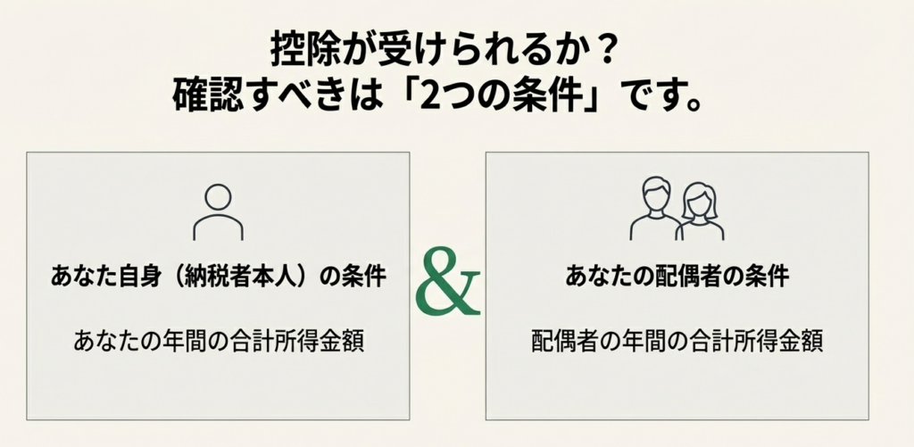 配偶者の所得要件に意識が集中しがちだが、大前提である「納税者本人の合計所得金額1,000万円以下」という要件を見落とすことは許されない。確認を徹底すること。