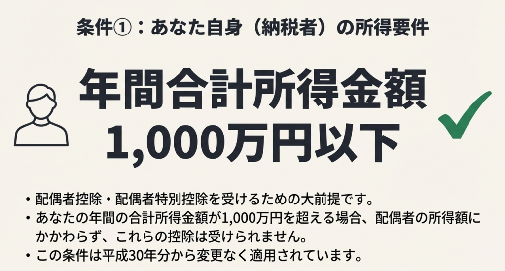 なお、上記の両制度に共通する大前提として、納税者本人の合計所得金額が1,000万円を超える場合は、配偶者の所得にかかわらず、配偶者控除および配偶者特別控除のいずれも適用できないことを絶対に看過してはならない。