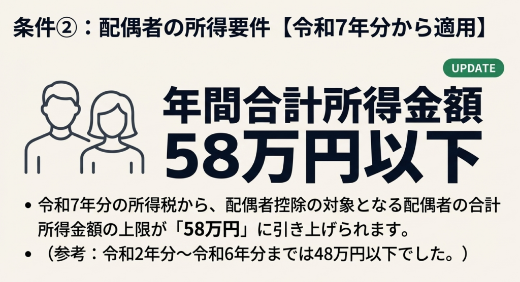 令和7年分以降、配偶者控除を受けるための配偶者の年間合計所得金額の上限は58万円以下です。この金額は令和7年12月1日に施行され、令和7年分から適用されるものです。