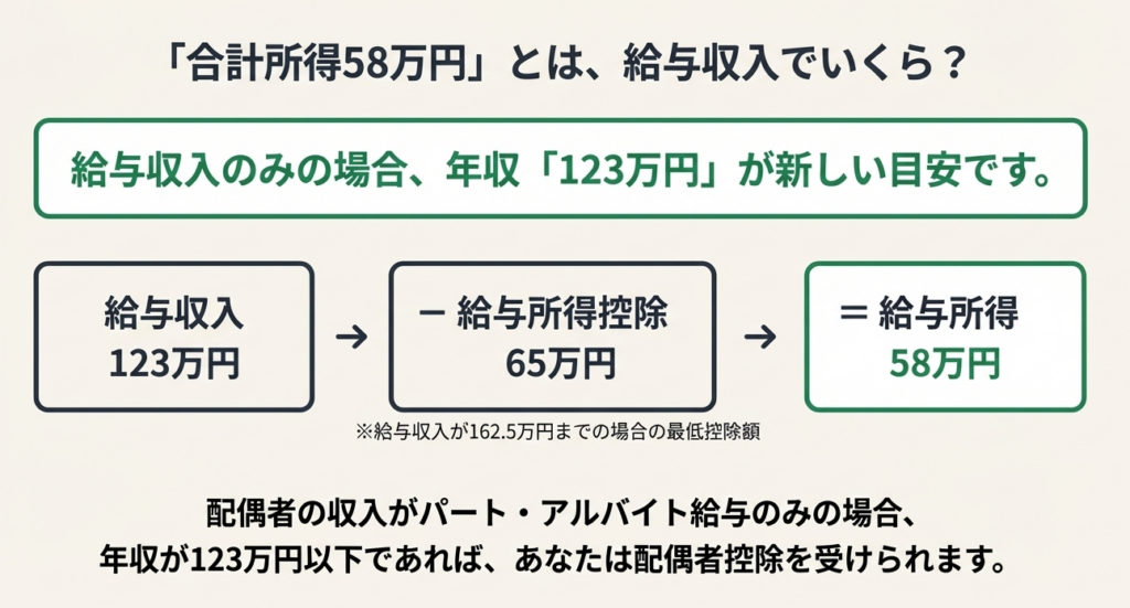 配偶者の年間の給与収入が123万円以下であれば、配偶者控除の対象となります。これは、給与収入123万円から給与所得控除額65万円を差し引くと、合計所得金額が58万円となるためです。