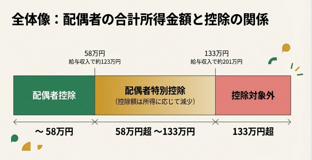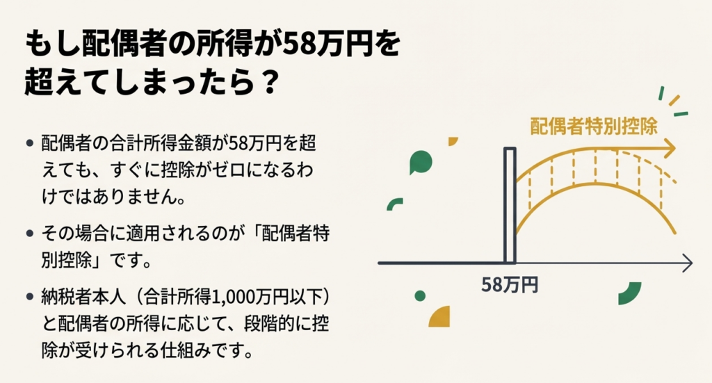配偶者の所得が58万円を超え、配偶者控除の対象から外れた場合でも、即座に「適用不可」と断定してはならない。合計所得金額が133万円以下であれば配偶者特別控除の適用可能性があるため、必ず次のステップとして検討するフローを遵守すること。