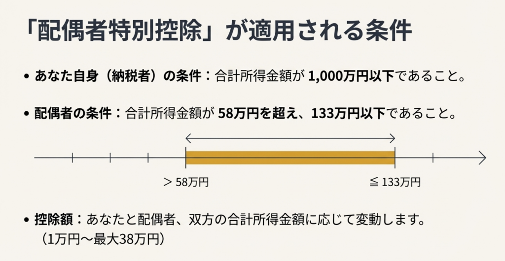 令和7年分以降、配偶者特別控除の対象となるのは、配偶者の合計所得金額が58万円を超え133万円以下の場合です。ただし、納税者本人の合計所得金額が1,000万円以下である必要があります。