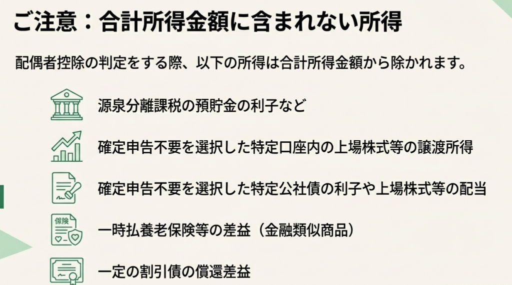 合計所得金額に含まれない所得の例として、「源泉分離課税とされる預貯金の利子」や「確定申告をしないことを選択した特定口座の源泉徴収選択口座内の株式等の譲渡による所得」が挙げられます。