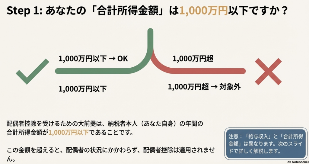 配偶者の所得要件にばかり注意が向きがちですが、大前提として納税者本人の合計所得金額が1,000万円を超えている場合は、配偶者控除も配偶者特別控除も一切適用できません。この根本的な要件の確認を絶対に見落とさないでください。