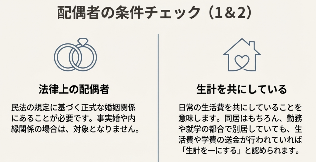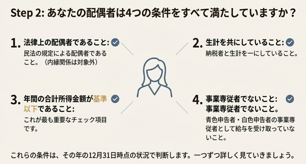 その年の12月31日時点で、(1)民法の規定による配偶者であること、(2)納税者と生計を一にしていること、(3)年間の合計所得金額が一定額以下であること、(4)青色申告者の事業専従者として給与を受け取っていない、または白色申告者の事業専従者でないこと、の4つの要件をすべて満たす必要があります。