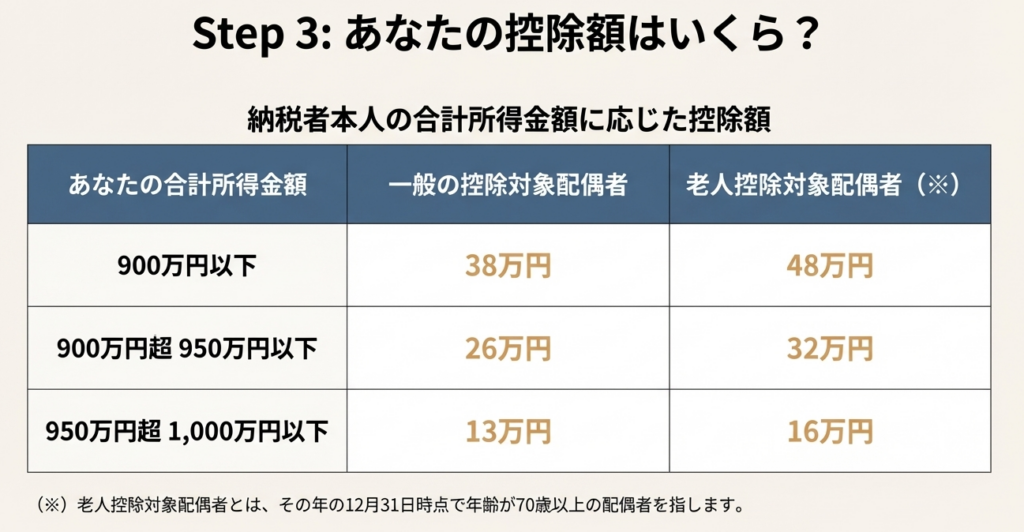 控除額は、納税者本人の所得と、控除対象配偶者がその年の12月31日時点で70歳以上かどうか(老人控除対象配偶者)の2つの軸で決定されます。具体的な金額は以下の表の通りです。