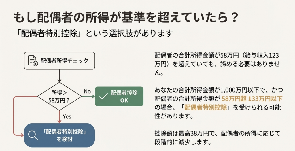 配偶者控除が適用できない場合でも、他の控除が適用できる可能性があります。この二つの制度は実務上、連続して検討すべきものです。