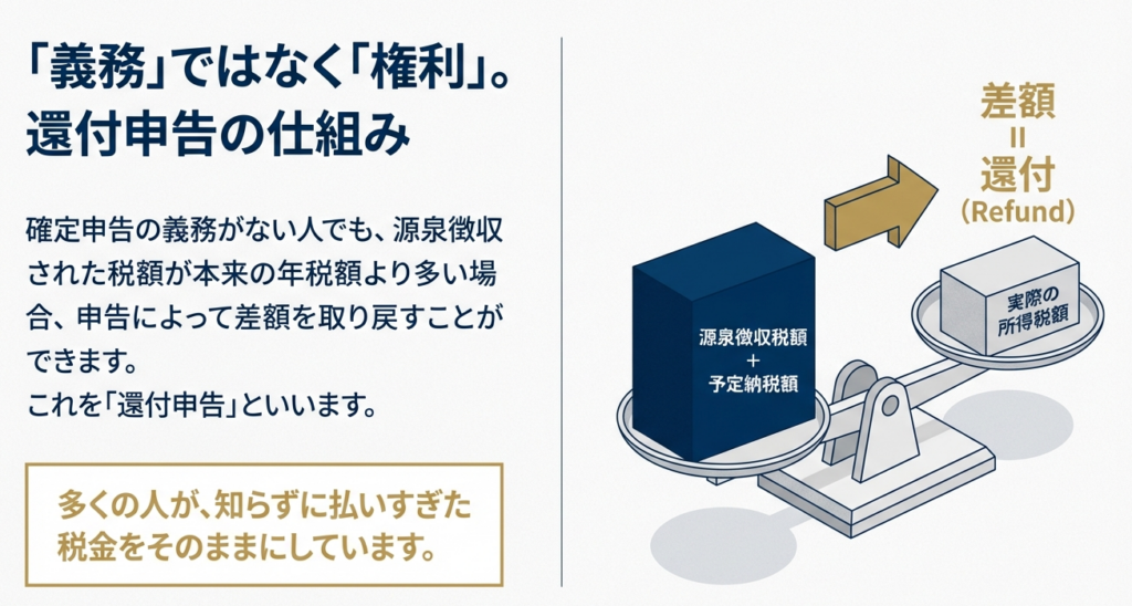 還付申告とは、納め過ぎた所得税の還付を受けるための手続きです。確定申告の義務がない人でも、源泉徴収された税額や予定納税額が、実際の所得から計算した税額を上回る場合に申告できます。
