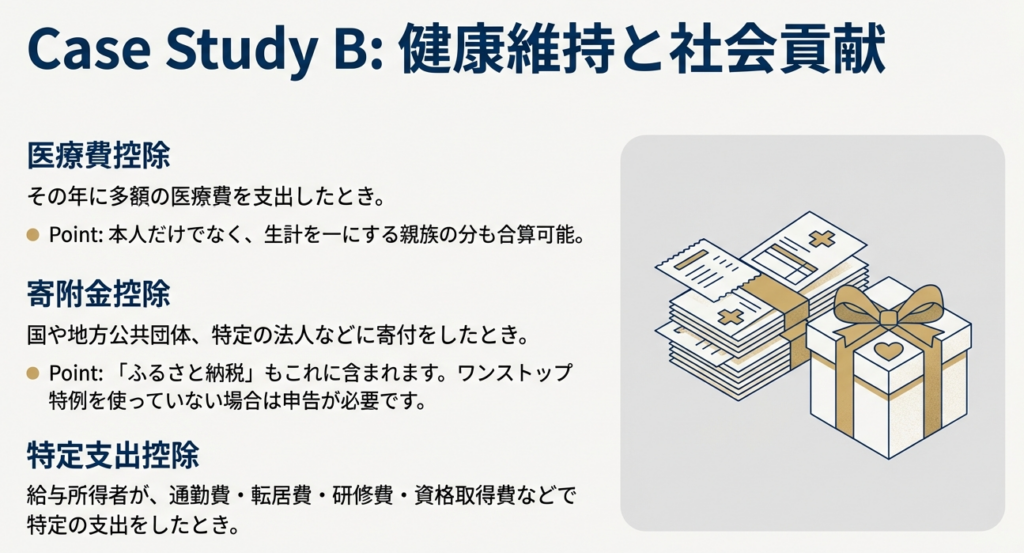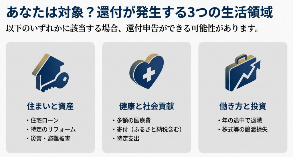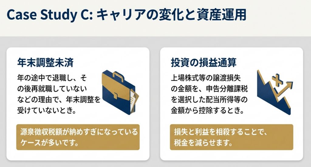 具体的なケースとして、年の途中の退職、住宅ローン控除の適用、多額の医療費支出、特定の寄附(寄附金控除)などが挙げられます。ただし、預貯金の利子など源泉分離課税とされる所得は対象外です。