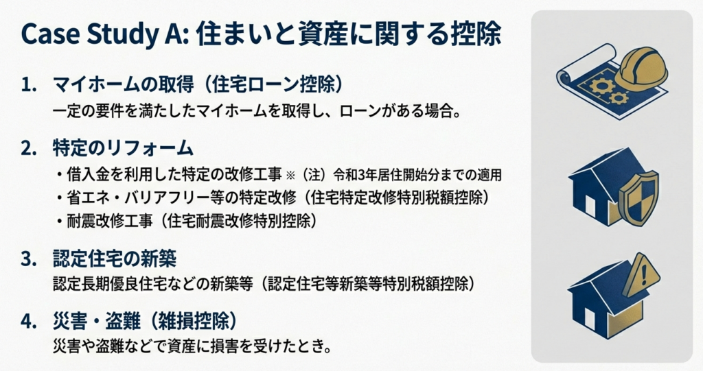 • 災害や盗難などで資産に損害を受けたとき(雑損控除):台風による家屋の損壊などが該当する。