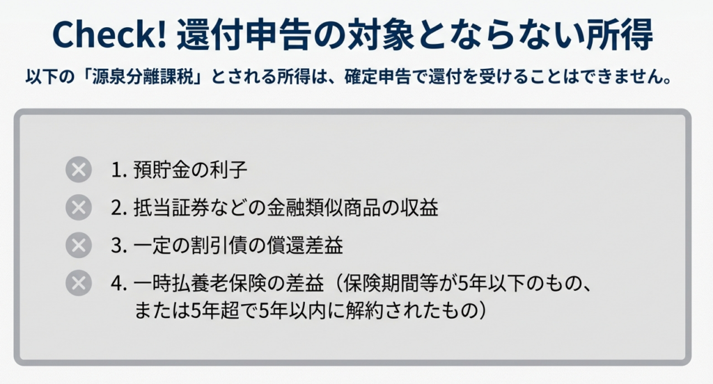 還付を受けられない所得の例として、(1)源泉分離課税とされる預貯金の利子、(2)源泉分離課税とされる一定の割引債の償還差益が挙げられます。これらは源泉徴収だけで課税が完結するため、還付の対象とはなりません。