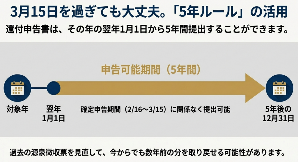 還付申告書は、対象となる年の翌年1月1日から5年間提出することができます。これは通常の確定申告期間(原則翌年2月16日から3月15日)とは関係ありません。