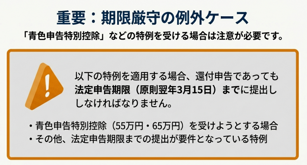 はい、例外はあります。例えば、青色申告特別控除(55万円または65万円)のような、法定申告期限(原則翌年3月15日)までの申告が適用要件となっている特例を受けたい場合は、還付申告であってもその期限までに提出する必要があります。