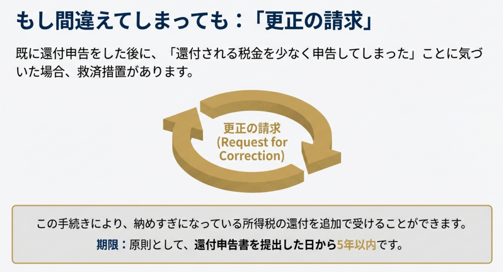「更正の請求」という手続きを取ることができます。この手続きにより、納め過ぎになっている所得税の還付を受けることが可能で、請求ができる期間は原則として還付申告書を提出した日から5年以内です。