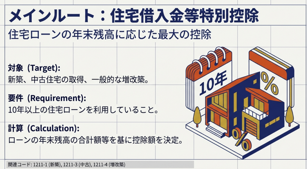 住宅ローン等を利用した場合、マイホームの新築、取得または増改築等のために利用した年末のローン残高等を基に計算した金額が、所得税額から控除されます。このカテゴリには、主要な「住宅借入金等特別控除」の他に「特定増改築等住宅借入金等特別控除」も存在します。