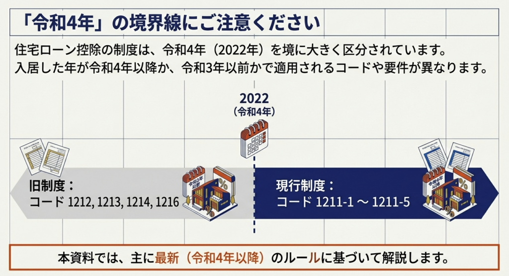 国税庁の関連コード一覧が「令和4年以降に居住の用に供した場合」と「令和3年までに居住の用に供した場合」で明確に区分されている点に注意してください。クライアントが居住を開始した年によって、適用される制度の名称や要件が大きく異なる可能性があります。ヒアリングの際は、必ず「居住開始年月日」を正確に確認するプロセスを徹底してください。