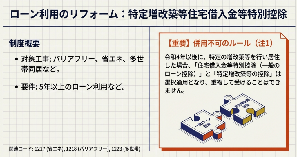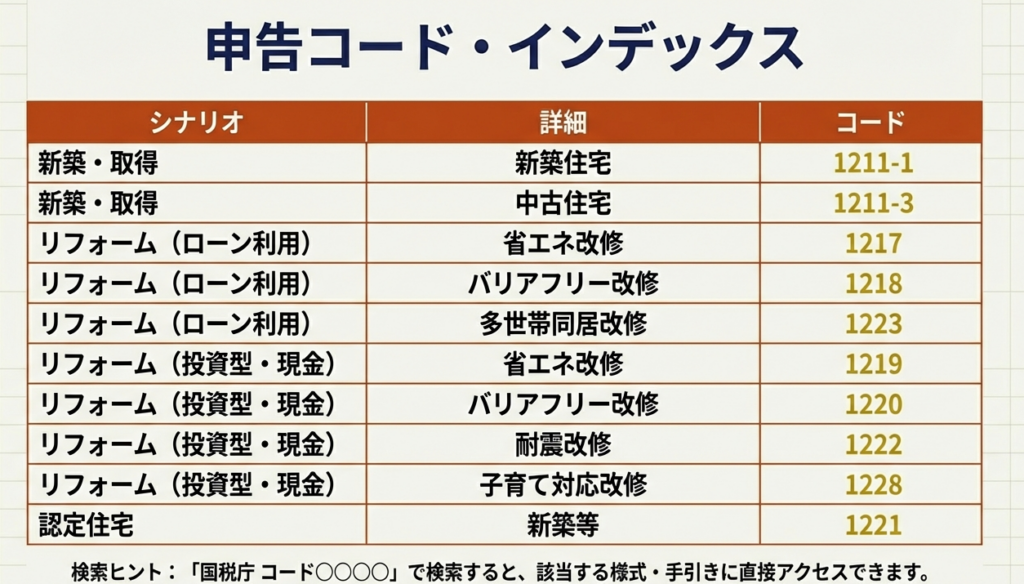 本通達は、あくまで制度の全体像を把握するためのものです。個別の案件に対応する際は、この概要レベルの知識だけで判断することは絶対に避けてください。必ず、国税庁の資料に記載されている「関連コード」(例:1211-1, 1214, 1222等)を参照し、それぞれの制度に定められた所得要件、床面積、工事内容といった詳細な適用要件を一つひとつ確認するプロセスを義務付けます。