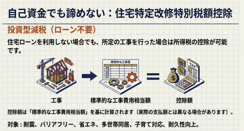 自己資金で住宅の改修等を行うなど、住宅ローン等を利用しない場合でも適用可能性がある税額控除制度が存在します。これらは特定の政策目的(住宅の質の向上など)を背景としており、主に以下の3つに分類されます。