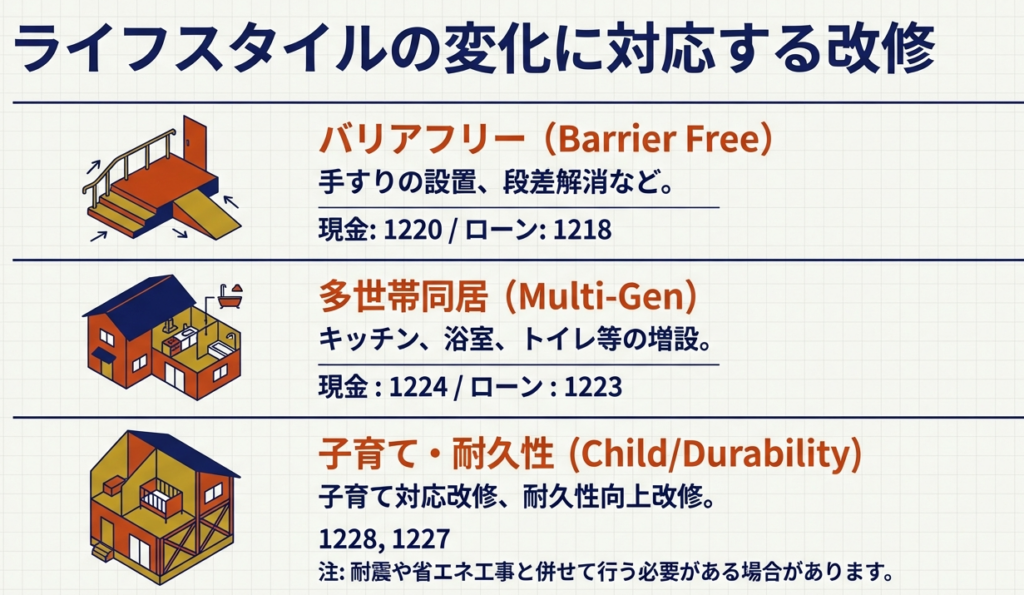 対象となる工事には、バリアフリー改修工事、省エネ改修工事、多世帯同居改修工事、子育て対応改修工事、耐久性向上改修工事などがあります。