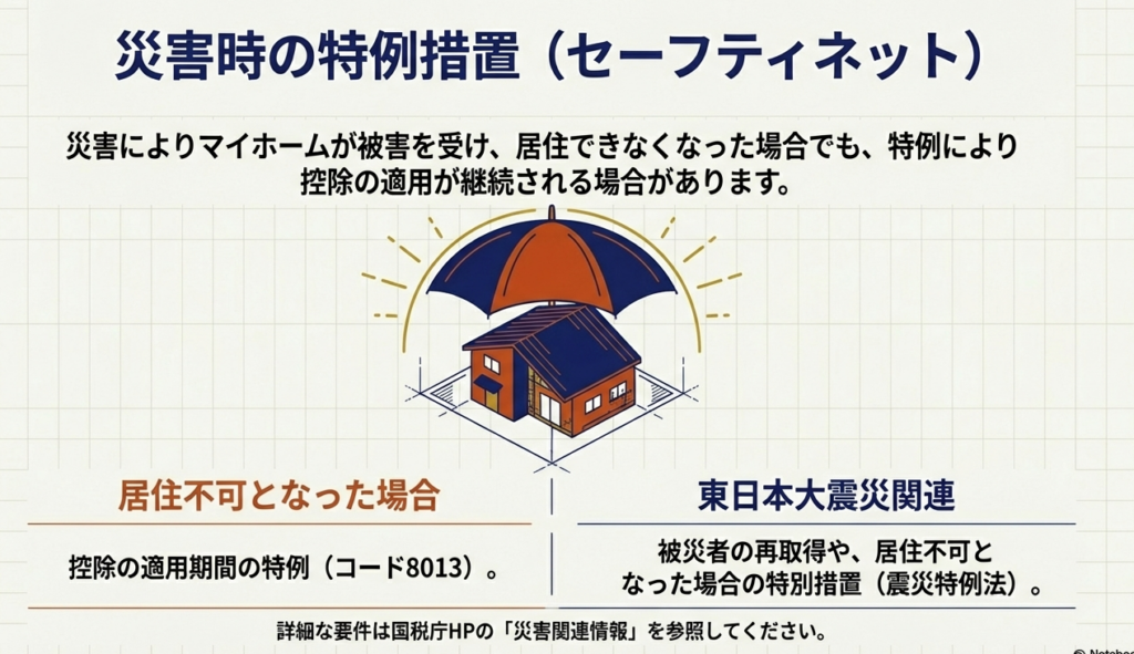 災害により控除適用中の住宅に居住できなくなった場合や、被災者が住宅を再取得等した場合に、適用期間の特例などの措置が用意されています。特に東日本大震災の被災者向けには、特別な追加措置が設けられています。